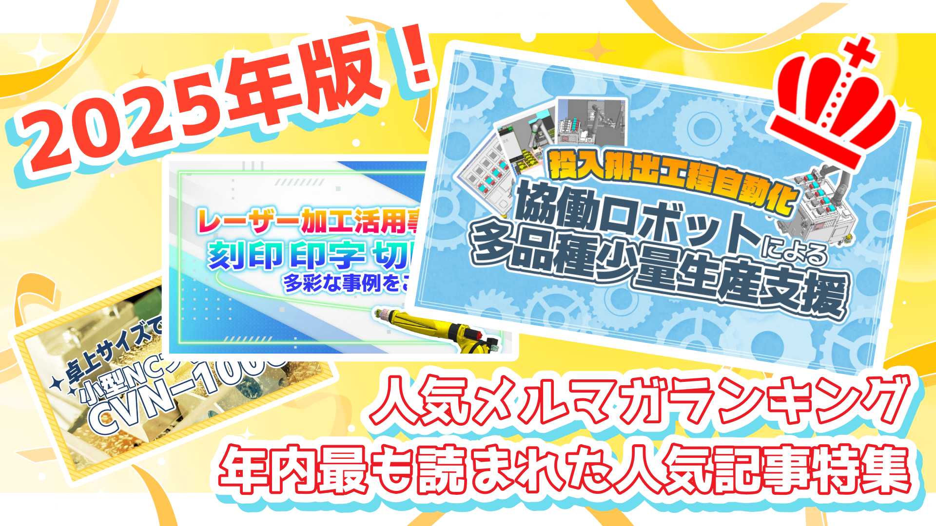 2025.01.06 【2025年版!】人気メルマガランキング – 2025年最も読まれた人気記事特集 榎本工業 技術ニュース vol.103|榎本工業株式会社 年末の慌ただしい時期となり、冷え込みもいよいよ本格的になってまいりました。 皆様におかれましては、いかがお過ごしでしょうか。 本年も榎本工業をご支援いただき、誠にありがとうございました。 心より御礼申し上げます。 今回のメルマガでは、2025年を通して特に反響の大きかった記事をピックアップしてご紹介いたします。 第1位 外段取りで停止時間を削減する小型マシニングセンタの記事です。新開発のパレット搬送部で最大4パレットを自動交換可能にし、効率化を実現します。記事内で詳しくご紹介しています。 記事はコチラ! 第2位 レーザー加工技術を活用した専用機の事例をご紹介。 刻印・印字・切断など、YVO4/CO2/ファイバーレーザーそれぞれの特性を活かした活用例を通して、現場課題への対応方法をまとめています。 記事はコチラ! 第3位 NCフライス盤のカスタム開発検討事例をご紹介。 外注していた小型部品の内製化に向け、お客様のご要望に合わせて設備仕様を検討した内容や、操作性・品質安定化を重視したポイントをまとめています。 記事はコチラ! 第4位 リニアコンベアモジュールを活用し、省スペース化と搬送スピード向上を実現した自動化ラインの事例をご紹介。 レイアウト自由度やタクト短縮など、従来コンベアとの違いや導入効果を分かりやすくまとめています。 記事はコチラ! 第5位 新設した「加工部品調達代行ナビ」 をご紹介。サイト開設の背景や特長、活用ポイントを分かりやすく解説しています。ぜひご覧ください。 記事はコチラ! いかがでしょうか。 本年は格別のご愛顧を賜り、心より御礼申し上げます。 来年もさらなる価値をお届けできるよう努めてまいりますので、引き続きよろしくお願いいたします。 皆さまのご健勝とご多幸をお祈り申し上げます。