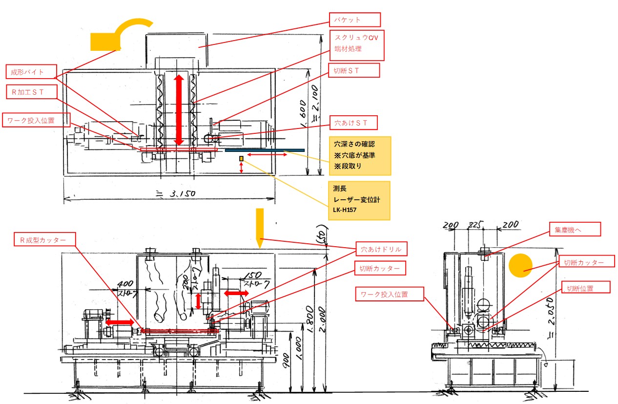 2026.02.19 【0から相談できる!】お客様に寄り添うオーダーメイドの専用機 榎本工業 技術ニュース vol.105|榎本工業株式会社 榎本工業では、現場の課題に寄り添い、用途に最適化されたオーダーメイド省人化設備を開発しております。 お客様の”こんな事ができないか?”というご要望を、長年の経験と柔軟な発想力で実現します。 提案の流れ 1. 【引合い・仕様打合せ】 まずは、ご要望や使用目的、予算を徹底的にヒアリングします。単なるスペックの追求ではなく、コストと性能のトータルバランスを考慮した、お客様にとっての「最適解」を一緒に探ります。 2. 【加工工程図の作成】 ワークの組付順序や要点を整理し、加工工程図を作成します。 3. 【構想・仕様図への展開】 工程図をベースに具体的な構想を描き、詳細な仕様へと落とし込んでいきます。お客様とイメージをすり合わせながら、納得のいく一台へと仕上げます。 提案事例 一例として、R加工、穴あけ、レーザーによる精度測定、切断などの工程を1台に集約した「複合加工設備」をご紹介します。 画像のような構想図を作成しながら、お客様のご要望に寄り添った設備をご提案します。 手書きのポンチ絵や、言葉だけでのご相談でも構いません。 お客様の「やりたいこと」を形にするパートナーとして、設計からアフターフォローまで一貫してサポートいたします!
